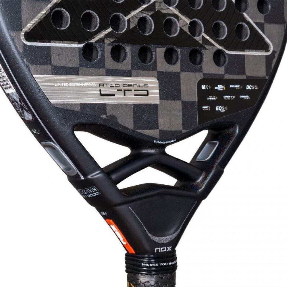 Eksklusiivne Nox Agustín Tapia AT10 Genius LTD Edition 2025 pakett on loodud kõige nõudlikumatele mängijatele, kes otsivad professionaalse tasemega reketit, mis pakub täiuslikku tasakaalu kontrolli ja jõu vahel – seda kõike koos Noxi kvaliteedi ja iseloomuliku disainiga.